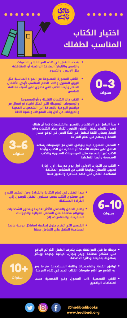 قام فريق حادي بادي بتجميع أهم خصائص المراحل العمرية المختلفة والكتب المناسبة لكل مرحلة في هذا الانفوجرافيك.