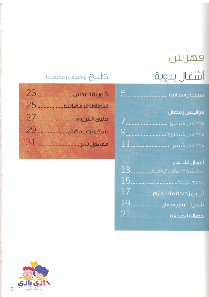 فهناك ثلاث طرق مختلفة لصنع فانوس رمضان مع إرفاق نموذج لفانوس مغلق بآخر الكتاب. كما أن هناك أفكار مبتكرة لصنع زينة رمضان وعمل حصالة الصدقة وشجرة النعم لمساعدة الطفل على التفكير بالآخرين وأيضا لتنمية روح الامتنان والقناعة لديه.