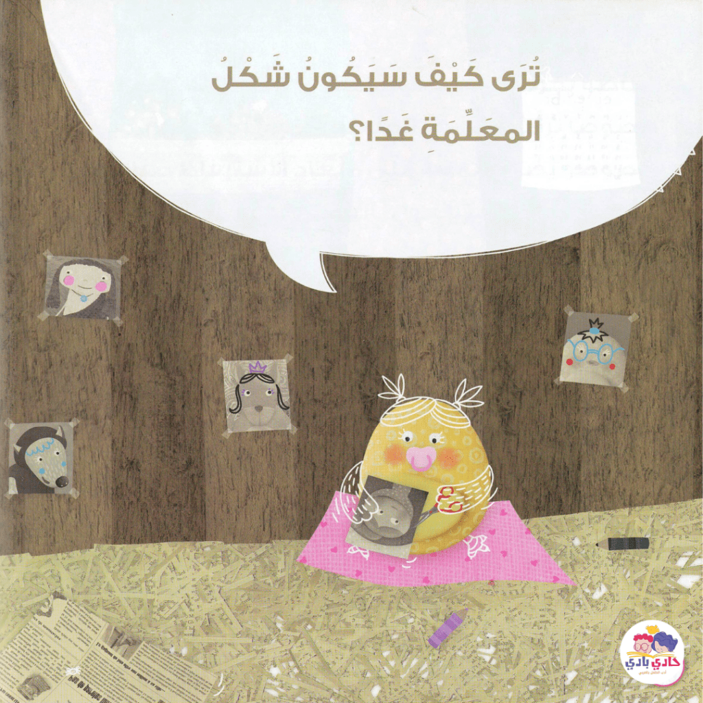 الكتاب ضمن سلسلة أبطالها الكتاكيت الصغار ومترجم من الفرنسية تحت عنوان À l’école des poussins من تأليف الكاتبة الكندية جيرالدين كوليه. وقد أعطت الكاتبة شخصيات مختلفة للكتاكيت فمنهم القلق، والمتفائل، والمتشائم، والواقعي. ويصلح الكتاب كمدخل للحديث عن المدرسة للصغار ومناقشة مخاوفهم وتوقعاتهم في بداية العام الدراسي الجديد.