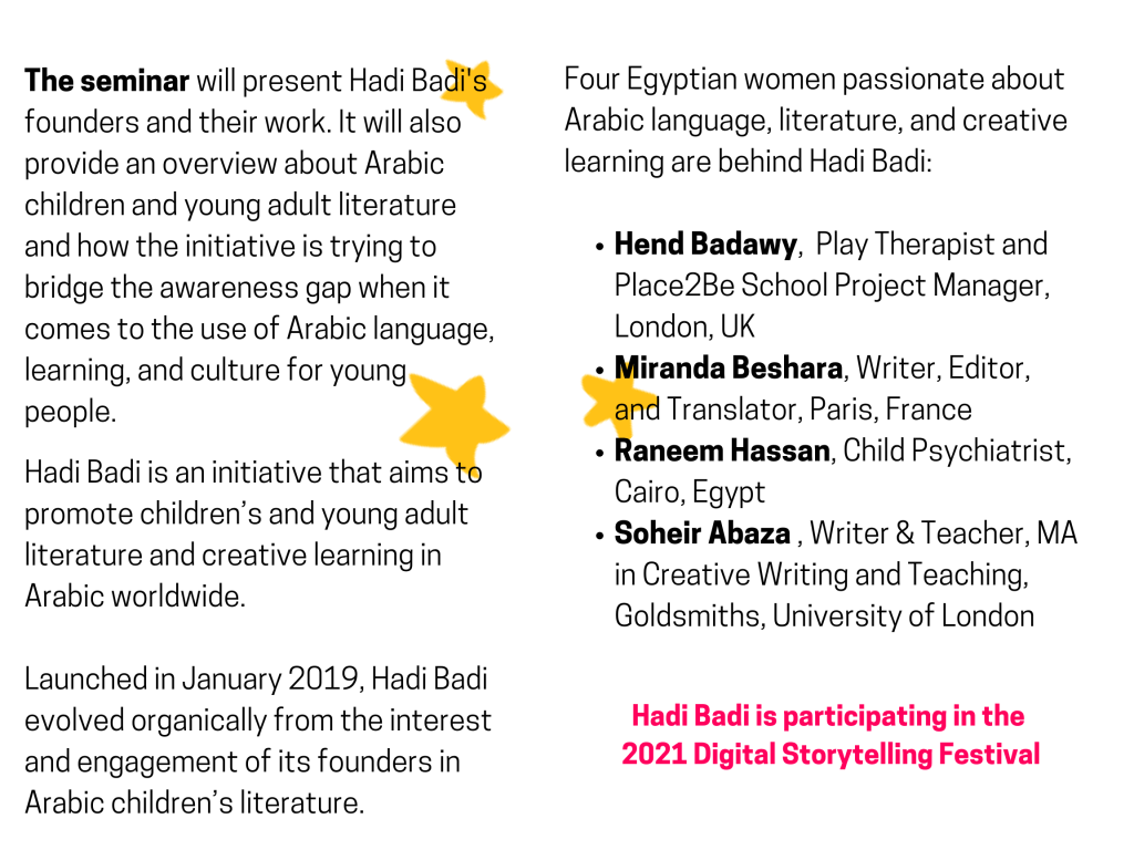 يستضيف مركز اللغة والثقافة والتعلم بجولدسميث، جامعة لندن فريق حادي بادي في ندوة مجانية أونلاين وباللغة الإنجليزية للتحدث عن المبادرة وأبرز الأنشطة التي تقوم بها لتعزيز الوعي بأدب الطفل واليافعين والتعلم الإبداعي باللغة العربية.