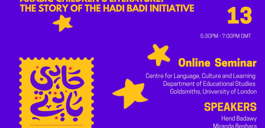 يستضيف مركز اللغة والثقافة والتعلم بجولدسميث، جامعة لندن فريق حادي بادي في ندوة مجانية أونلاين وباللغة الإنجليزية للتحدث عن المبادرة وأبرز الأنشطة التي تقوم بها لتعزيز الوعي بأدب الطفل واليافعين والتعلم الإبداعي باللغة العربية.