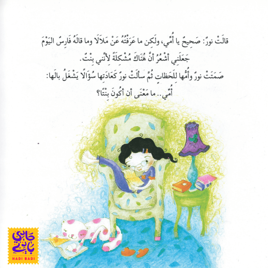 تأخذنا الكاتبة لبنى شكري من خلال حوار شيق بين نور وأمها في رحلة البحث عن إجابة مثل هذا السؤال الصعب حتى تدرك بطلتنا بنفسها ما معنى أن تكون بنتا. وجاءت رسوم رانيا أبو المعاطي بخطوطها الانسيابية وألوانها الزاهية لتكمل النص وتصوير خيال وأحلام نور.