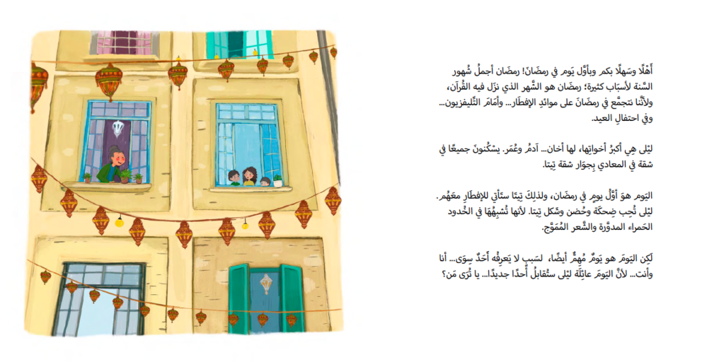 عن طريق سرد سلس ولغة عربية بسيطة، تنقلنا الكاتبة المصرية دينا العبد إلى أجواء وطقوس رمضان العائلية مع رسوم شروق بشناق المرحة والطفولية.