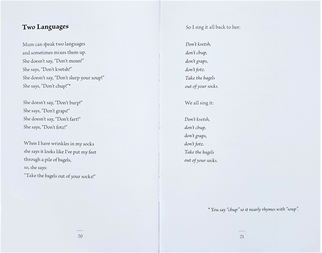 تجسد القصائد قصة الترحال في لحظة وداع على محطة قطار، في سفينة داخل زجاجة تزين مدفأة البيت، في بضع صور ورسائل بنية اللون، في معطف يحفظ للحفيد رائحة جد لم يره، في وصفة أكل تقليدية، أو في أغنيات بلهجات مختلفة يتمتمها الأب ويتذكرها الابن قبل النوم. يتجلى دور التعددية الثقافية واللغوية في حياة الشاعر فتَظهر القصيدة بهيئة مُهاجر يَخلط بعض الكلمات اليديشية (لغة يهود أوروبا) والألمانية والفرنسية بالإنجليزية. فعن طريق اللغة المحلية يمكن نقل صورة المكان وحفظه في الذاكرة.