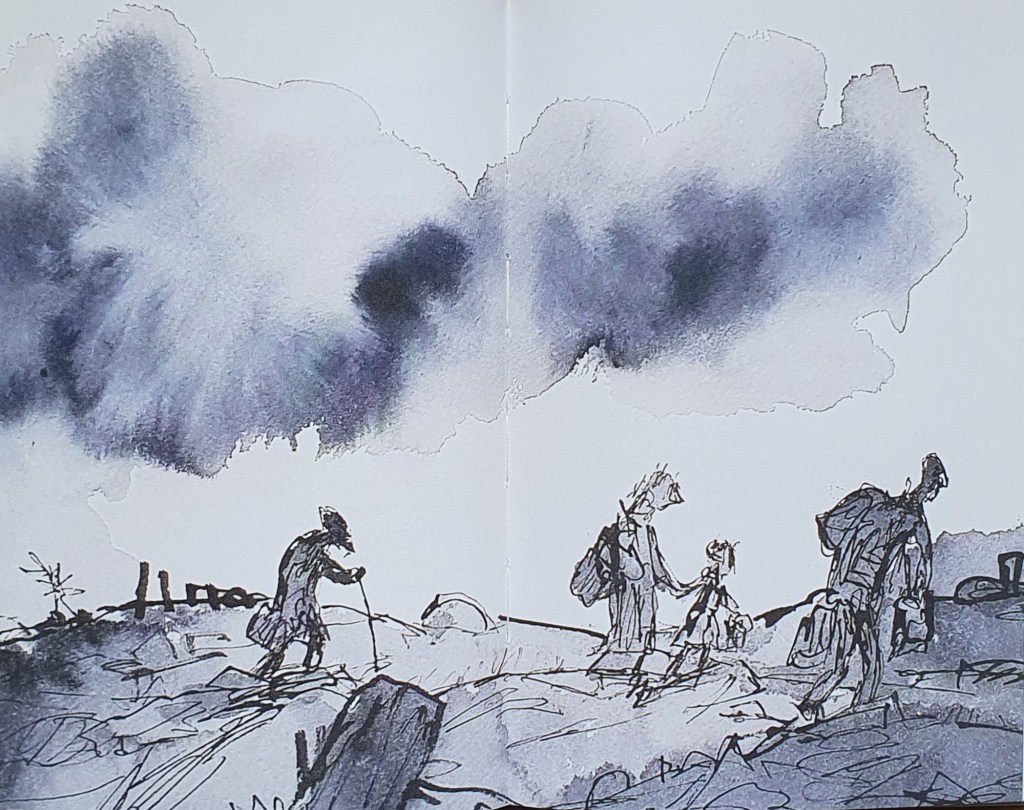 وتأتي رسومات الرسام الشهير كوينتين بليك لتكمل حكايا النزوح، مستمدة قوة تأثيرها من تجربة شخصية مر بها الرسام كطفل عندما تم نقله إلى منطقة أخرى بغرب إنجلترا أثناء الحرب العالمية الثانية. الشخصيات المرسومة غير واضحة الملامح فهي لا تصور مجموعة محددة من البشر وإنما تبرز تشابك أيدي العائلات النازحة كبارًا وصغارًا. وكذلك تبدو وكأنها رسمت بقلم حبر عادي على عجل مع إضافة ألوان مائية قاتمة ليخيم اللون الرمادي على خلفية المكان.