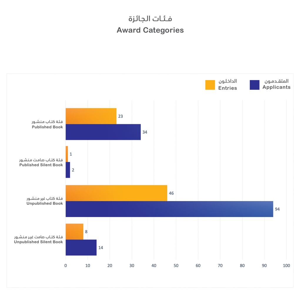 تقدم 144 رساما من أنحاء العالم العربي بأعمالهم في فئات الجائزة المختلفة وتم اختيار 78 منهم للإشتراك في فئات الجائزة المختلفة التي تصدرتها فئة “كتاب غير منشور” من حيث عدد المتقدمين.