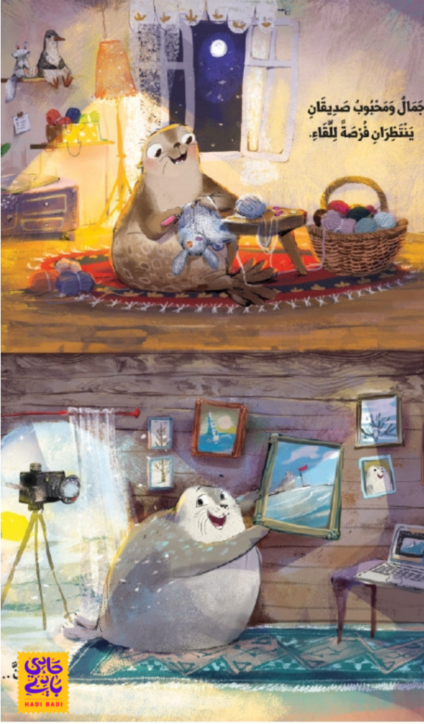 نسجت الكاتبة والناشرة وئام أحمد قصة تعيد الدفء للقلوب عن فقمتين صديقين جمعتهما الكثير من اللحظات رغم بعد المسافات . تميزت القصة أيضا بعناصر الفكاهة والتشويق مما يجعلها قريبة من قلب الصغار والكبار. وبرع الفنان علي الزيني في نقل أحداث القصة من خلال رسومات مليئة بالتفاصيل الحميمة سواء في تصوير الكائنات أو الأماكن الجغرافية المختلفة باستخدام تقنية الكوميكس في السرد ونقل لنا أجواء السفر والشحن عن طريق صور الطوابع البريدية، وسندات الشحن، والتوقيعات، والأوزان المختلفة والعديد من الشحنات ووسائل النقل التي تأتي وتذهب من الشمال إلى الجنوب. كما جاء الإخراج الفني مختلفا حيث أن الكتاب يتم فتحه من أعلى لقراءته بالطول حتى يتماشى مع أحداث القصة التي تدور بين القطبين وبينهما خط الإستواء.