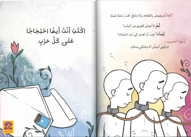 “الحرب شريرة ، لا أحبها، تأخذ اللعب والضحك من الصغار، و تأكل حلوياتنا، وتحرق بيوت العصافير، أتمنى أن أجد مصباح علاء الدين السحري، لأطلب من المارد أن يحبس الحرب، حتى لا تؤذي أي طفل في العالم”.