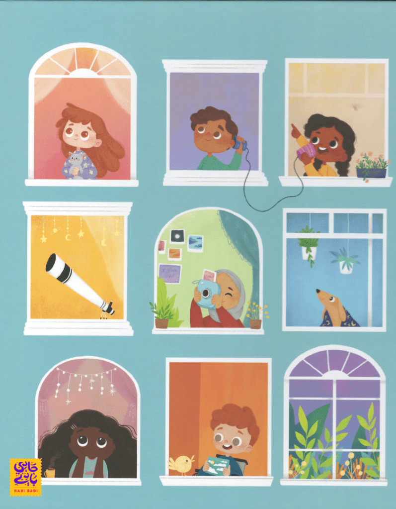 الكتاب له غلافين : غلاف ورقي عليه مشهد جماعي مع عنوان الكتاب ليغطي الغلاف الصلب المرسوم عليه شبابيك بخلفيات السماء الملونة وتطل منها شخصيات وأشياء أخرى نصادفها في القصة.