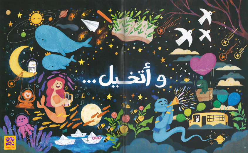 استخدمت الكاتبة أيضا الأسهم الصغيرة لتعريف الأطفال على بعض المسميات المرتبطة بالصورة مثل الأغصان والثمار والجذور عندما نتخيل أننا شجرة. وجاءت الأشياء التي من الممكن أن نتخيلها متنوعة من الكواكب إلى الجبال والكائنات الحية وحتى الخرافية منها.