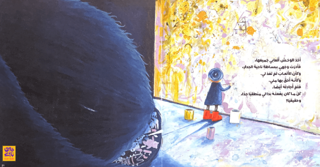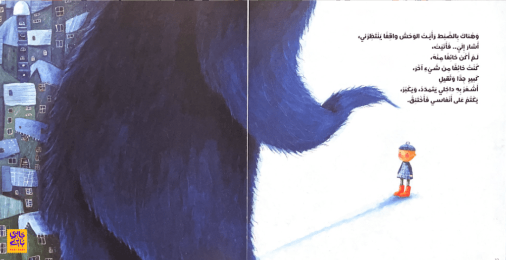 وأعطت رسومات الفنانة الفلسطينية براء العاوور عمقاً شديداً للقصة حيث رسمت الوحش كثيف الشعر وعملاقاً كحلي اللون. وجاءت الخلفيات كلها بألوان غامقة لتعكس الجو العام الحزين الذي يشعر به الطفل ومع تغير حالته المزاجية، بدأت الألوان تجد طريقها على صفحات الكتاب.