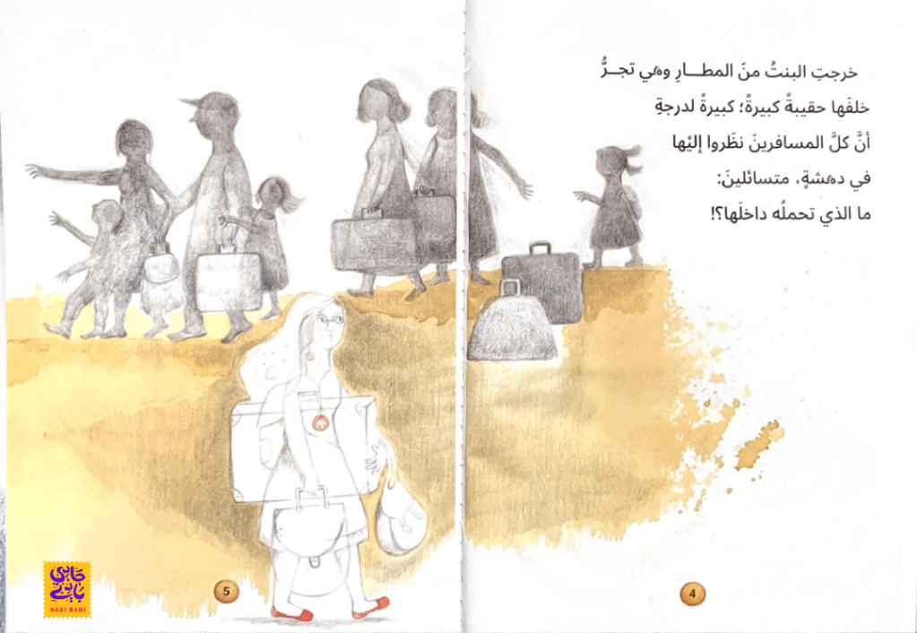 تنتقل بطلة القصة إلى بلد جديد وبيت جديد وتحمل معها حقيبة كبيرة تلفت انتباه الجميع. وبمجرد دخول البيت، تبدأ الفتاة بفتح الحقيبة وتخرج منها أشياء كثيرة مثل: قطة مشمشية، ونخلة صغيرة وكتاب، وهدهد وعبوات توابل وأشياء كثيرة مختلفة… لكل منها دلالة وذكرى تربطها ببلادها وتمدها بالاطمئنان والأمان. ومع كل شئ يخرج من الحقيبة، تدونه الفتاة في دفتر صغير للتعريف بكل محتويات الحقيبة وسمت دفترها “قاموس الحقيبة”. يا ترى ما الأشياء الأخرى التي تحملها في الحقيبة؟ وما الحكايات وراء هذه المقتنيات العزيزة؟