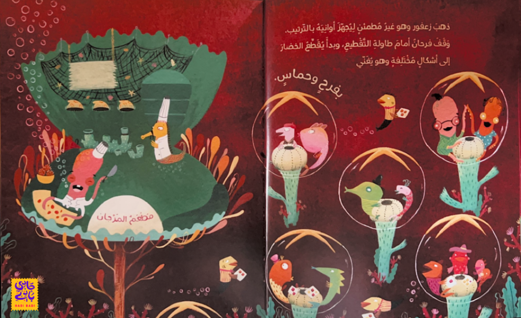مطعم مرجان موجود في أعماق البحر، يرأسه طباخ ماهر وشديد الترتيب وهو حصان البحر “زعفور” ومساعده على دراية كاملة بكل قواعده ويتبعها باتقان شديد. لكن في يوم مهم، مرض مساعد الطباخ زعفور وحل مكانه أخطبوط مرح و لطيف يدعى “فرحان”. المشكلة أن فرحان يتبع طريقة مختلفة تماما في الطهي وتقطيع الخضروات. يا ترى كيف سيتصرف زعفور عندما يكتشف ما فعله فرحان؟ و كيف سيكون رد فعل زبائن مطعم مرجان أمام هذه التغييرات؟