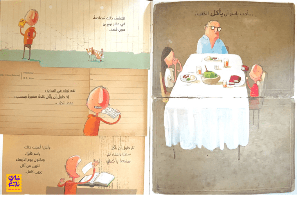 اكتشف ياسر بالصدفة أنه يحب أكل الكتب عندما تذوق كلمة صغيرة في أحد الأيام. ومرة بعد مرة أصبح يستطيع ابتلاع الكثير من الكتب. ومع كل كتاب يبتلعه، تذهب المعلومات إلى الدماغ و يصير أذكى وأذكى. لكن فجأة انقلب الحال رأساً على عقب وبدأت تظهر المشاكل. يا ترى ما الذي حدث لياسر؟ وهل يستطيع أن يجد حلًا لمشاكله؟
