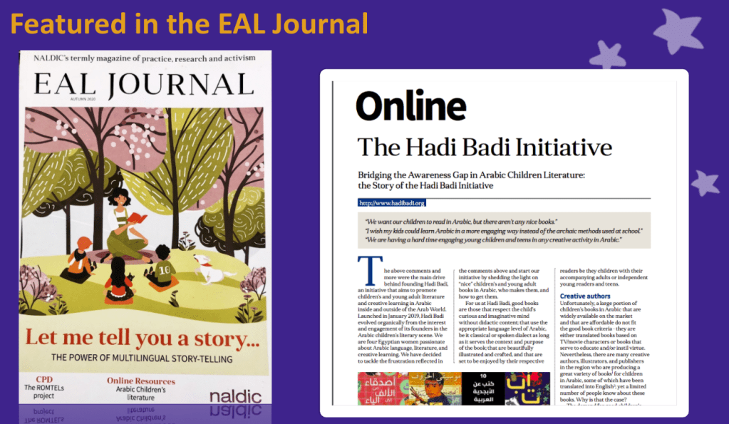 Hadi Badi is an initiative that aims to promote children’s and young adult literature and creative learning in Arabic worldwide. Launched in January 2019, Hadi Badi evolved organically from the interest and engagement of its founders in Arabic children’s literature.